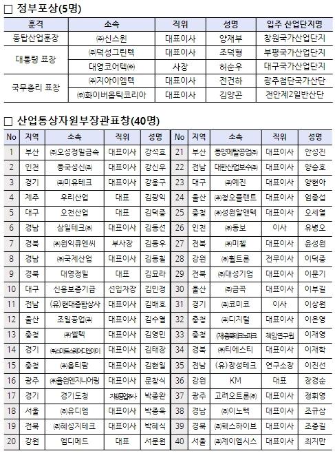 올해 기념식 행사는 ‘산업단지의 날’이 법정기념일로 지정된 후 개최되는 첫 번째 행사이며 산업단지 발전에 공로가 높은 117명이 정부포상 등을 수상했다. 동탑산업훈장에 양재부 ㈜신스윈 대표이사, 대통령표창에 허순우 대영코어텍㈜ 사장 외 1명, 국무총리표창에 김양곤 ㈜화이버옵틱코리아 대표이사 외 1명, 그리고 강석효 ㈜오성정밀금속 대표이사 등 40명이 산업통상자원부장관표창을 수상했다.