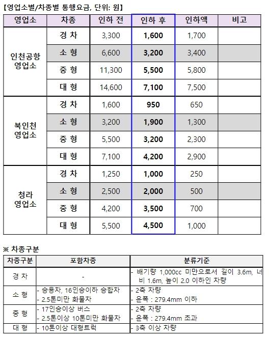 북인천 영업소는 3,200원에서 1,900원(40.6%), 청라 영업소는 2,500원에서 2,000원(20%)으로 각각 인하된다.