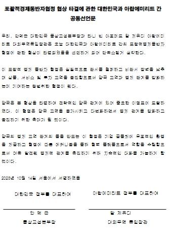 [중앙뉴스라인, 우제헌기자] 산업통상자원부 안덕근 통상교섭본부장은 10월 14일 서울에서 '타니 빈 아흐메드 알 제유디'(Thani bin Ahmed Al Zeyoudi) 아랍에미리트(UAE) 경제부 대외무역 특임장관과 한?UAE 통상장관회담을 개최하여 한-UAE 포괄적경제동반자협정(CEPA) 협상을 최종 타결하고 이를 확인하는 공동 선언문(별첨)에 서명했다. 협상 타결 기준으로 한-UAE CEPA는 우리나라가 체결한 24번째 자유무역협정이다.