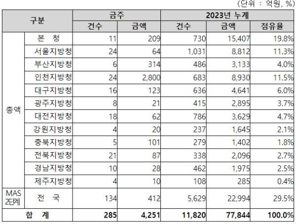 지역별 발주량을 보면, 총액계약 대상 3,839억 원 중 본청이 209억 원으로 5.4%를 집행하고 서울청 등 11개 지방청에서 3,630억 원을 각각 집행할 예정이다.