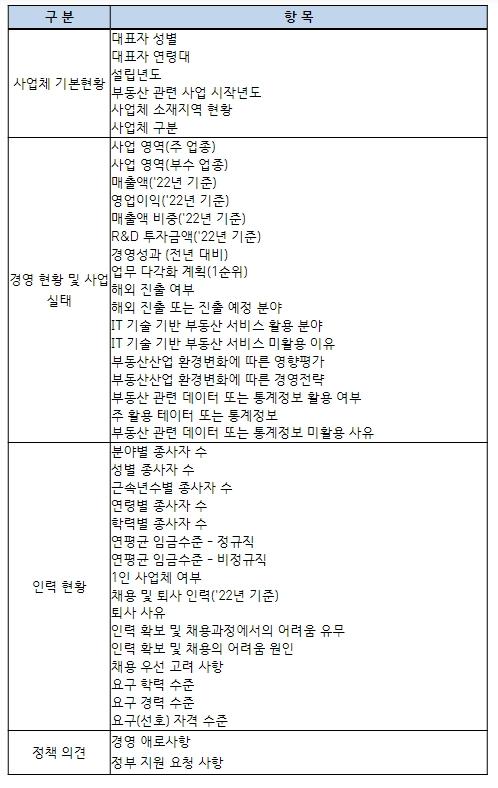 ‘부동산서비스산업 실태조사’에서는 부동산서비스산업을 영위하는 사업체의 △기본현황, △경영 현황 및 사업 실태, △인력 현황, △정부지원 요청 사항 등 부동산서비스산업 진흥 정책 수립 등에 필요한 기초자료를 조사?분석하여 공표할 계획이며,