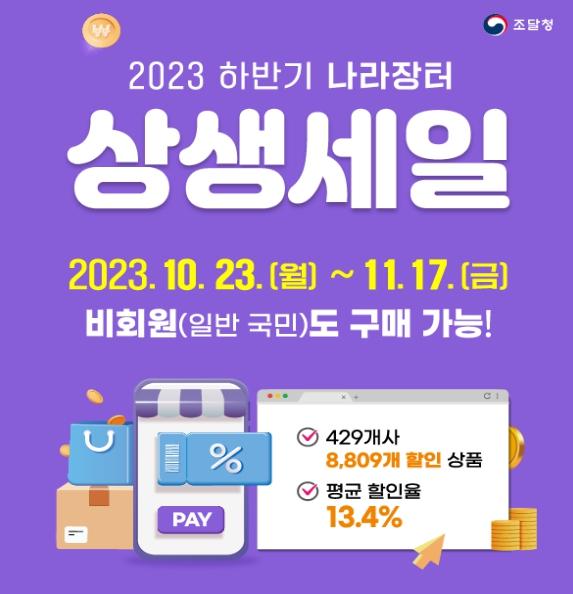 [중앙뉴스라인, 우제헌기자] 조달청은 조달기업의 판로를 지원하고, 수요기관에게 예산절감의 기회를 제공하기 위한 ‘2023년 하반기 나라장터 상생세일’을 오는 10월 23일부터 11월 17일까지 한 달간 개최한다.