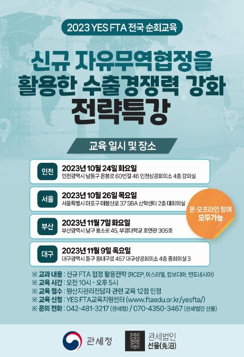 [중앙뉴스라인, 우제헌기자] 관세청은 10월24일부터 11월9일까지 4차례에 걸쳐 수출입 기업 관계자 등을 대상으로 관련 분야 전문 관세사와 함께 '신규 자유무역협정(FTA) 활용전략'을 주제로 특강을 개최한다.