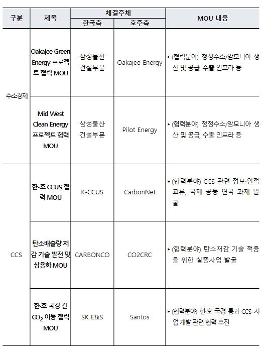 한편, 이번 호주 방문을 계기로 양국 기관·기업들이 수소, 이산화탄소 포집·저장(CCS) 분야에서 총 5건의 양해각서(MOU)를 체결했다.