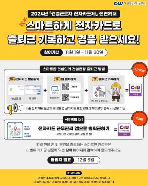 이번 이벤트는 내년부터 퇴직공제 의무 가입 대상 모든 건설공사(공공 1억 원, 민간 50억 원 이상)에서 전자카드제가 적용됨에 따라, 건설근로자가 사전에 전자카드를 발급받고 ‘전자카드’ 또는 ‘모바일 앱’으로 출·퇴근을 기록하도록 활성화하고자 마련됐다.