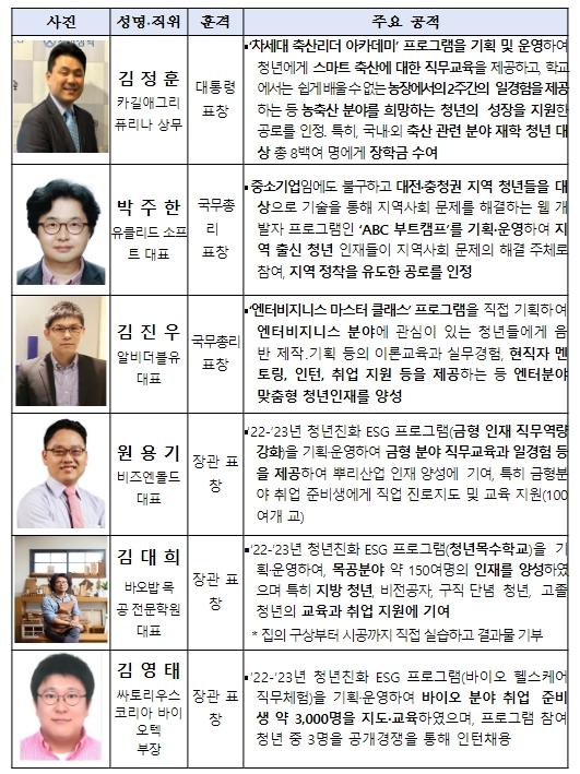 이날 포상을 받은 청년친화 ESG 분야 일자리창출 유공자는 총 6명으로, 대통령 표창은 카길애그리퓨리나 김정훈 상무, 국무총리 표창은 유클리드소프트 박주한 대표이사, 알비더블유 김진우 대표이사, 고용노동부 장관 표창은 비즈엔몰드 원용기 대표이사, 바오밥목공 전문학원 김대희 대표이사, 싸토리우스코리아바이오텍 김영태 부장이 수상했다.
