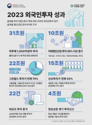 국내 최대 규모 외국인투자 유치 행사인 이번 인베스트 코리아 서밋(IKS)에는 방한 외국인투자가, 국내외 유수 기업, 주한 외국상의, 정부·지자체 등 1,500여 명 이상이 참여한다. 정부는 이번 행사를 통해 그간의 외국인투자 유치 성과를 공유하는 한편, 한국의 매력적인 투자환경과 첨단산업 중심지로 우뚝 서기 위한 전망(비전)을 제시할 계획이다. 현재 우리나라는 전 세계 투자가 위축된 상황에서도 ?22년 305억 불, ?23년 3분기 누계 239억 불 등 사상 최대의 외국인투자 실적을 거듭 갱신하는 등 전 세계 투자가들의 주목을 받고 있다.