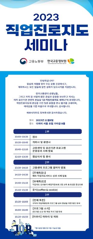 한국고용정보원(원장 김영중)은 11월 8일 10시, 더케이 호텔(서울 서초구)에서 '2023 직업진로지도 세미나'를 개최했다.