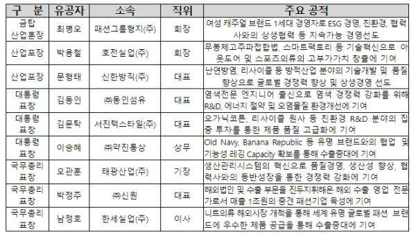 산업포장은 우수한 봉제 기술력 및 제품의 품질 경쟁력을 토대로 매출액의 약 95% 이상을 수출하고 있는 호전실업(주) 박용철 회장과 국내 원료회사와의 상생 협력 및 적극적인 기술개발 투자를 통해 그간 수입에만 의존해오던 원료를 국산화하여 불에 잘 타지 않는 방염 원사를 생산 및 판매하고 있는 신한방직(주) 문형태 대표가 수상했다.