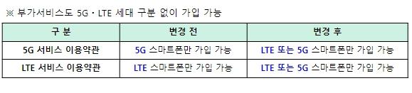 SKT는 5G 서비스 이용약관과 LTE 서비스 이용약관에 명시된 서비스 가입 가능 단말기 종류를 확대ㆍ변경했으며, 23일부터 기존ㆍ신규 가입자 모두 단말 종류(5G, LTE)에 따른 제약 없이 5GㆍLTE 요금제에 가입 가능하다.