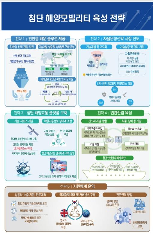 마지막으로 첨단 해양모빌리티 관련 국내 신기술(설비?기자재)의 상용화를 앞당기기 위해 민간 주도의 기술검증제도를 도입하는 한편, 선진국 수준의 기술 개발과 국제표준화 선점을 위해 국제 연구거점 구축과 전문인력 양성 등도 추진한다.
