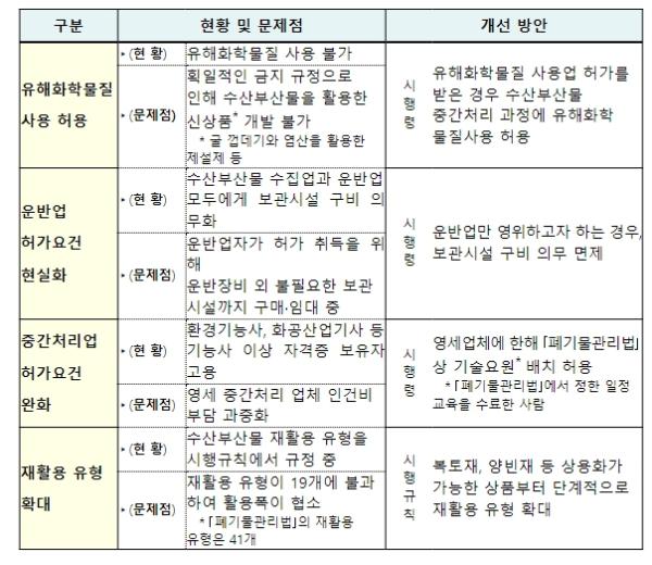 이 밖에도 ?화학물질관리법?상 유해화학물질 사용업 허가를 받은 경우에는 수산부산물 재활용 과정에 필요한 유해화학물질을 사용할 수 있도록 해주고, 수산부산물 운반업만 하는 업체는 보관시설 구비의무를 면제하는 등 현장 건의사항을 적극 반영하여 규제 개선의 체감도를 더욱 높였다.