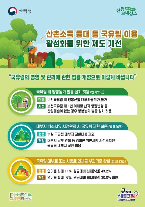 또한, 대부지 대부료 미납 등 경미한 위반사항에 대해 시정조치가 확인된 날로부터 5년이 경과하면 국유림을 교환할 수 있도록 하고, 대부료 등 연체금 이율을 최대 상한 6% 이내, 최고 30% 미만으로 징수하는 등 국유림 대부분야의 규제를 완화했다.