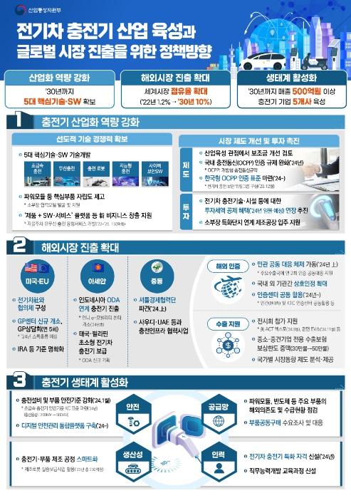 정부는 업계 간담회 등을 통해 전기차 충전기 산업 육성과 글로벌 시장 진출을 위한 정책방향을 마련했다. △충전기 산업화 역량 강화, △해외시장 진출 확대, △충전기 생태계 활성화 등 3대 축으로, ’30년까지 5대 핵심기술?SW를 확보하고, 세계시장 점유율을 ’22년 1.2%에서 ’30년 10%로 끌어올리는 한편, 매출 500억원 이상 충전기 제조사를 5개 이상 육성한다는 목표를 제시했다.