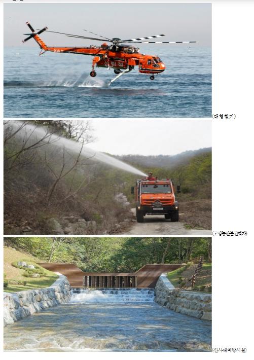 인공지능으로 산불을 실시간 감시하는 과학기반 산불감시체계 구축(20개소, 32억), 산불 공중진화의 핵심인 산림헬기 확충(대형1대, 중형1대, 80억) 등 산불대응 역량을 강화한다. 또한, 산사태로 인한 인명피해 방지를 위해 산사태 취약지역 조사를 확대(45천개소, 110억)하고, 그간 부처별로 각각 관리된 산림 내 인위적 개발지(농경지, 과수원, 도로 등) 정보를 통합 관리하는 디지털 사면통합 산사태정보시스템(신규, 17천개소, 33억)과 하천으로 유입되는 산림계곡 유량의 실시간 모니터링을 위한 관측망(신규, 33억)을 구축한다.
