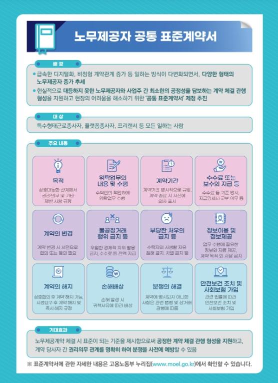 최근 일하는 방식이 다변화되면서 다양한 형태의 노무제공자들이 증가 하고 있으나, 실태조사 결과 서면 계약을 하지 않아 분쟁이 발생하거나 계약 관련 내용을 잘 모르는 등 현장 종사자들은 어려움을 겪고 있는 것으로 나타났다. 이에 노무제공자와 사업주가 보다 동등한 지위에서 계약조건에 관한 기본적인 사항을 공정하게 정하고 준수할 수 있도록 공통 표준계약서를 제정했다.