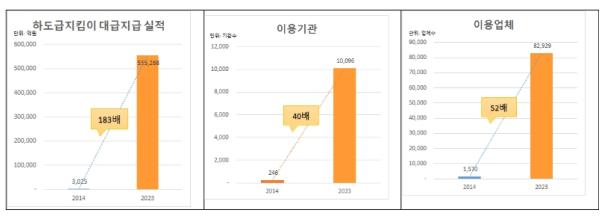 지난 2014년부터 운영한 하도급지킴이는 올해까지 55.5조원의 대금지급을 지급했고 1만 96개 공공기관과 8만 2,929개 조달업체가 이용하는 시스템으로 성장했다.