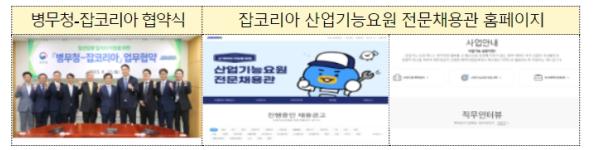 뿐만 아니라 취업정보 전문업체인 잡코리아와 업무협약을 맺고, 잡코리아 누리집 내에 ‘산업기능요원 전문채용관’을 ’23. 8. 16.에 개설했다. 이를 통해 병역지정업체 채용정보 및 취업 팁 등을 제공하고 있으며, 11월 말까지 8,666명이 방문했다.