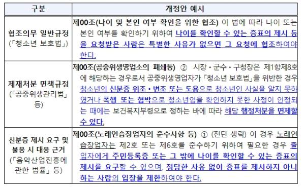 먼저 '청소년 보호법'에 나이 확인을 요청받은 사람이 이에 협조해야 하는 의무규정을 명문화하여 나이 확인과 관련한 사업자 등의 부담을 덜게 했다. 그리고 '공연법', '음악산업진흥에 관한 법률' 등 4개의 법률에 구매자 등이 신분 확인에 협조하지 않았거나 신분증 제시 요구에 응하지 않은 경우 영업장 출입이나 물건 구매 등을 제한하는 근거를 명시했다.