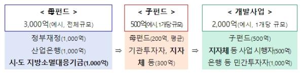 지역활성화 투자 펀드는 지역·민간 주도의 대규모 투자를 신속 추진하기 위해 마련된 제도로, 민간투자의 마중물 역할을 하는 모펀드는 정부재정(1,000억)과 산업은행 출자(1,000억), 그리고 지방소멸대응기금(광역계정, 1,000억)으로 총 3,000억 원 규모로 올해 최초로 조성된다.