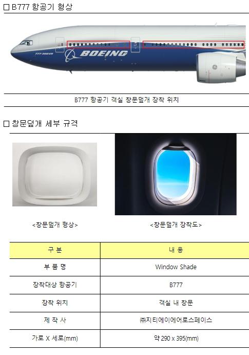 [중앙뉴스라인, 우제헌기자] 국토교통부는 국내 중소업체인 ㈜지티에이에어로스페이스가 개발한 B777 항공기 객실 창문덮개(Window Shade)에 대해 안전성 인증을 완료(’24.1.12 국토부)하고 국내 항공사에 공급한다고 밝혔다.