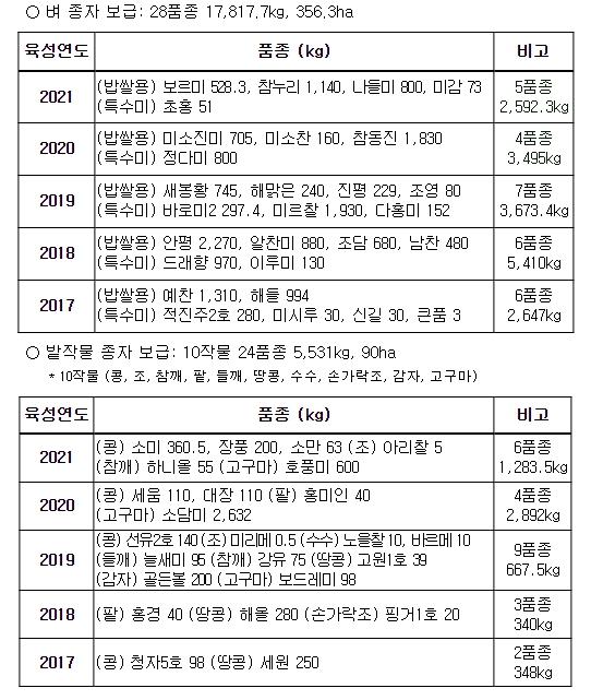 올해는 벼, 콩, 고구마, 감자 등 10작물 114품종 4만 1,181kg을 분양한다. 이 가운데 최근 5년 이내 육성한 품종은 벼 26품종, 밭작물 25품종이다.
