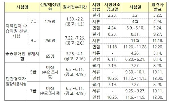 오는 1월 30일 7급 지역인재 선발시험부터 원서접수 일정이 시작되며, 이어 중증장애인 경채시험 3월 26일, 5·7급 민간경력자 일괄채용시험 6월 3일, 9급 지역인재 수습직원 선발시험이 7월 22일에 각각 진행된다.