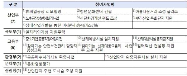합동공모에는 산업부의 휴폐업공장리모델링, 청년문화센터 건립 등 7개사업을 비롯하여 고용부의 근로환경개선을 위한 중소기업 직장어린이집 지원, 산재예방시설 설치지원 등 6개 사업, 국토부의 일자리연계형 지원주택 등 6개 부처 18개 사업이 포함됐다.