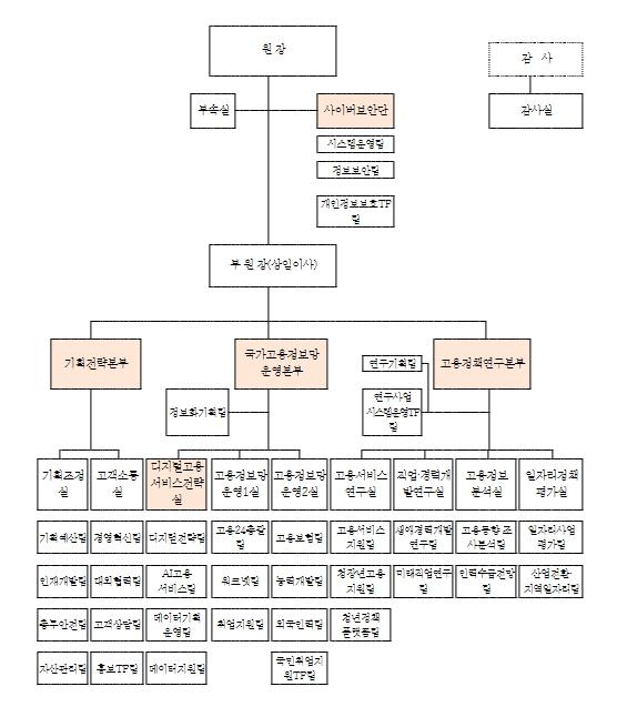 고용정보원은 정부 혁신 기조에 맞춰 대부서화를 통해 팀을 축소하되, 핵심 업무를 재배치하고 사이버 보안 및 디지털 전략기능을 강화하기 위한 취지로 기관 경영·정보화·연구 분야별 3본부 체계로 개편했다.