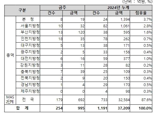 지역별 발주량을 보면, 총액계약 대상 303억 원 중 본청이 19억 원으로 6.3%를 집행하고 서울청 등 11개 지방청에서 284억 원을 각각 집행할 예정이다.