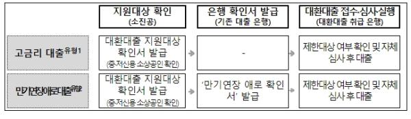 대환대출 취급은행은 대환 대상 대출이 7% 이상 금리인지, 3개월 성실상환 중인지 등 지원조건 충족 여부를 확인한 후 대환대출 지원 시 상환가능성을 심사하여 최종적으로 대출 여부를 결정한다.