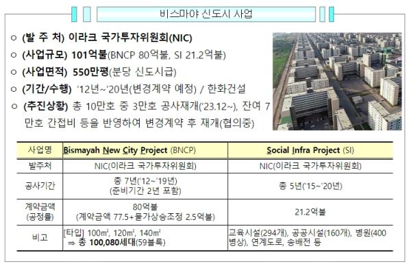 대규모 도시 개발사업인 이라크 비스마야 신도시 사업이 본격 재개됨에 따라 최대 15개의 추가 신도시를 계획 중인 이라크 재건사업 진출에도 청신호가 켜질 것으로 예상된다.
