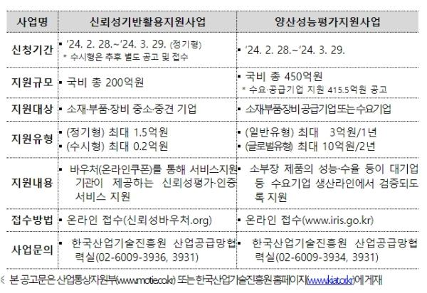 [중앙뉴스라인, 우제헌기자] 소부장 기업의 신뢰성 평가 및 양산 성능평가 지원을 위한 ’24년도 사업이 본격적으로 추진된다. 산업통상자원부는 ’24년도 소부장‘신뢰성기반활용지원사업’과‘양산성능평가사업’을 산업통상자원부 및 한국산업기술진흥원(KIAT) 홈페이지에 공고하고 신청기업 지원을 받는다고 밝혔다.