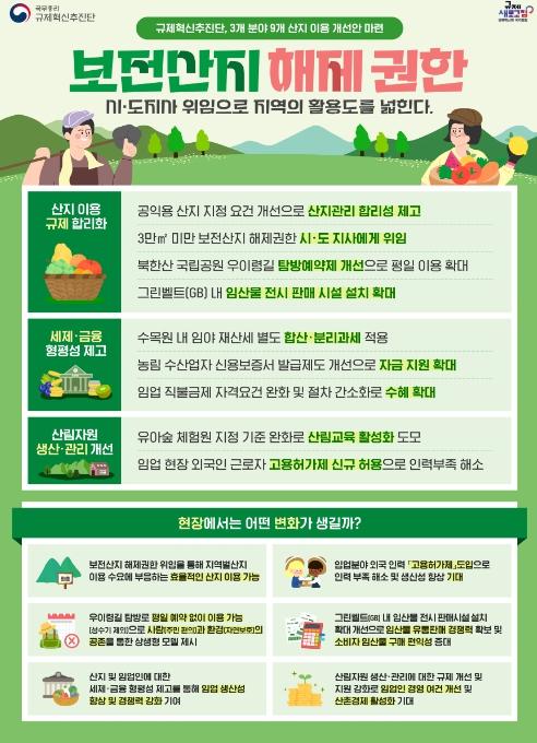 아울러, ?산지관련법령 개정을 통해 소규모 면적 보전산지 해제에 대한 시ㆍ도지사 위임규정을 마련할 계획이며, 지자체 여건에 따라 신속한 의사결정이 가능해질 것으로 예상된다. 이에 따라 주민 편의시설인 지자체 청소년 및 노인요양시설 등 지역의 역점 추진시설의 설치가 탄력을 받을 것으로 기대된다.