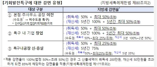 이에 따라, 수도권에서 비수도권 기회발전특구로 이전하는 기업은 부동산 취득가액의 한도 없이 취득세 등 지방세를 감면받을 수 있게 됐다.