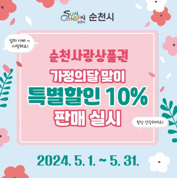 [중앙뉴스라인, 전은희기자] 순천시가 5월 1일부터 5월 말까지 1개월간 가정의 달을 맞아 순천사랑상품권 특별할인(10%) 판매를 실시한다고 밝혔다.