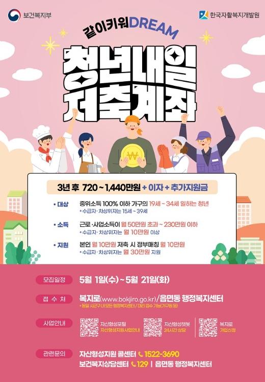청년내일저축계좌는 가입자가 3년간 근로활동을 지속하면서 매월 본인적립금을 10만원이상 저축하면 정부가 매월 ‘차상위이하’유형에 30만원, ‘차상위초과’유형에 10만원의 근로소득장려금을 지원해 주는 사업이다.