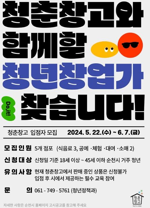 모집 규모는 5개 점포(식음료 3, 공예?체험?대여?소매 2)이며 신청일 기준 18세 이상 45세 이하 순천시 청년이면 지원 가능하다.