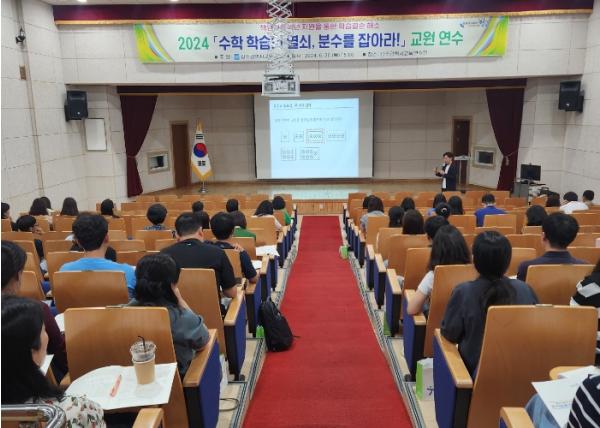 연수는 부산교육대학교 수학교육과 이동환 교수를 초청해 ▲학생들은 분수를 왜 어려워할까? ▲분수 지도의 방향 등 초등학교 분수 영역의 지도법과 구체적인 지도 사례를 소개했다. 정확한 분수 개념 및 단계별 분수 지도 과정이 다뤄져 교원들이 학생들에게 분수 개념을 올바르게 이해시킬 수 있도록 했다.