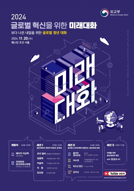 [중앙뉴스라인, 신기철기자] 외교부는 11월 20일 서울(웨스틴 조선 호텔)에서 ‘보다 나은 내일을 위한 글로벌 청년 대화’라는 주제로 2024년 글로벌 혁신을 위한 미래대화를 개최한다.