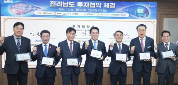 [중앙뉴스라인, 김민수기자] 전라남도는 25일 도청 서재필실에서 ㈜포스코, 디아이지에어가스㈜ 등 2개 기업과 1조 2천42억 원 규모의 투자협약을, 이양산업단지개발㈜과 60만 5천㎡ 규모의 산업단지 개발 업무협약을 했다.