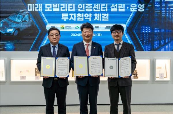 [중앙뉴스라인, 김민수기자] 전라남도와 영암군은 12일 아시아 유일 자동차 보안 인증자격 자율주행 플랫폼 기업인 아우토크립트(주)와 ‘미래 모빌리티 인증센터’ 설립을 위한 투자협약을 했다.