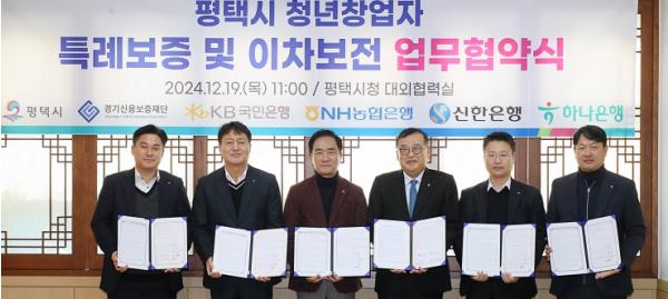 [중앙뉴스라인, 김영환기자] 평택시는 19일, 시청 대외협력실에서 경기신용보증재단, KB국민은행 평택중앙종합금융센터, NH농협은행 평택시지부, 신한은행 평택금융센터, 하나은행 평택금융센터 등과 함께 청년 창업자 특례보증 및 이차보전 지원사업 확대를 위한 업무협약을 체결했다.