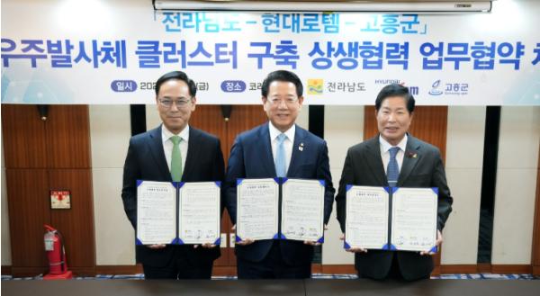 현대로템은 우주발사체 클러스터 구축에 적극 협력하고, 전남도와 고흥군은 행정 지원 등에 최선을 다한다는 내용을 담고 있다.
