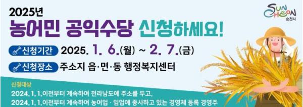 [중앙뉴스라인, 전은희기자] 순천시는 ‘2025년 농어민 공익수당’ 신청을 오는 2월 7일까지 주소지 관할 읍면동 행정복지센터에서 접수한다고 밝혔다.