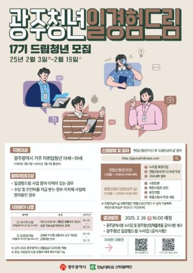 문의는 카카오톡채널 ‘광주청년드림’과 광주청년 일경험드림 사업단으로 하면 된다.