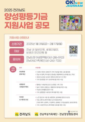 올해 참여를 희망하는 법인과 단체에서는 지원 신청서 등 필요한 서류를 준비해 전남도 여성가족정책관실로 우편(등기) 제출하면 된다.