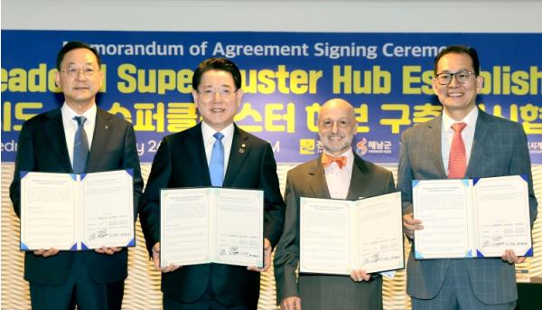 [중앙뉴스라인, 김민수기자] 전라남도는 26일(현지 시간) 미국 샌프란시스코 하얏트 호텔에서 퍼힐스(FIR HILLS), 서남해안기업도시개발(주), 해남군과 함께 ‘솔라시도 AI 슈퍼클러스터 허브’ 구축을 위한 업무협약을 체결했다.