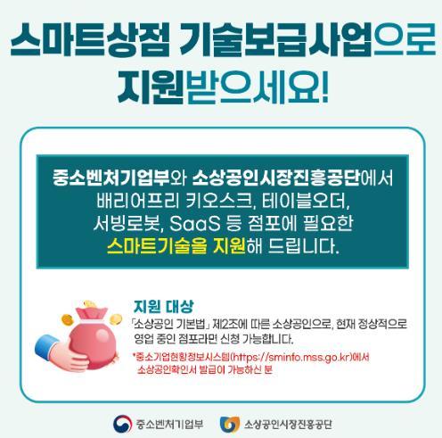 소상공인시장진흥공단에서 접수하고 있는 이번 스마트상점 기술보급사업은 장애인·고령자·임산부 등 모든 사람이 불편없이 이용할 수 있는 키오스크인 ‘배리어프리 키오스크’를 지원하는 사업으로 홈페이지를 통한 온라인 접수만 가능하다.