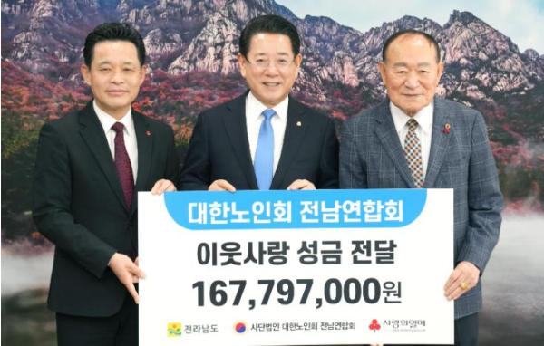[중앙뉴스라인, 김민수기자] 전라남도는 14일 대한노인회 전남연합회가 사회복지공동모금회에 이웃사랑 성금 1억 6천800만 원을 기탁했다고 밝혔다.